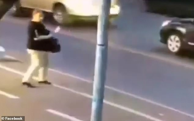 Footage shows her approaching the three-year-old boy, who is holding his mother’s hand, and slashing the child across the face.