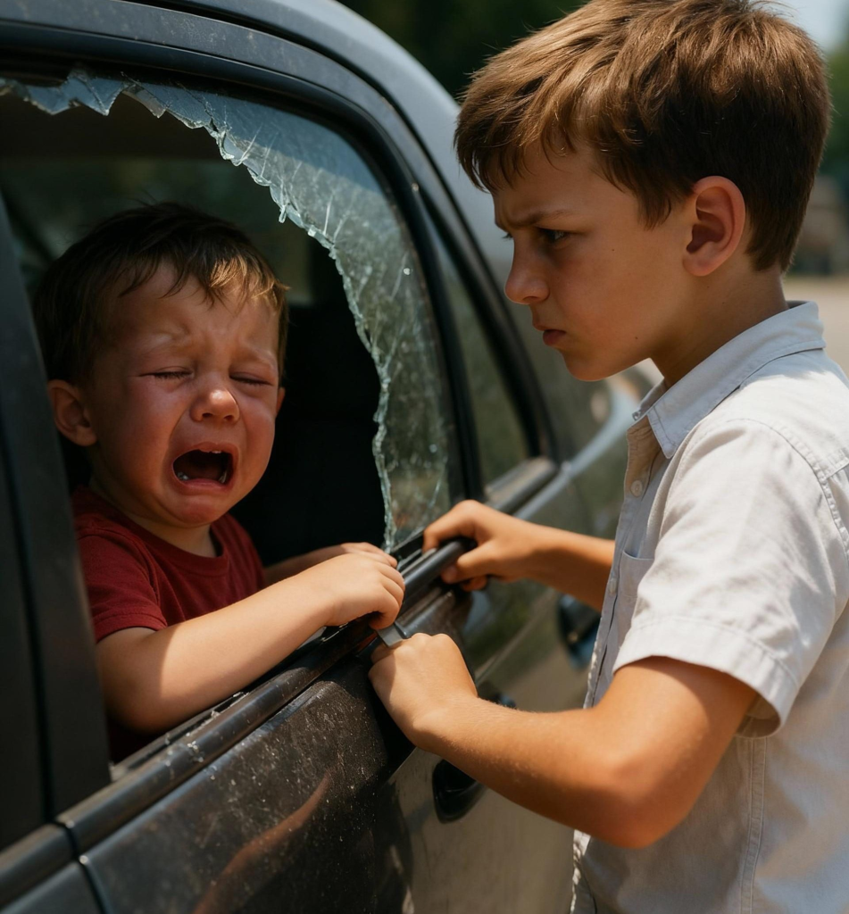 As he dashed across the street, something caught his eye. A gray car was parked by the curb. Inside, on the passenger seat, sat a small child—no older than his little brother. The child was crying, pounding weakly against the window, his voice hoarse from shouting for help. His cheeks were flushed, and his breath came in short, uneven gasps. The heat inside the car looked unbearable.