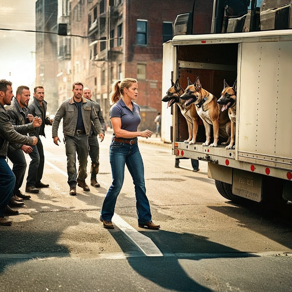 Ignoring them, she unbuckled the crates, allowing Thunder and Shadow to jump down. Their lean, muscular bodies tensed as they began to survey the area. Shadow, the darker of the two, let out a low growl, as if sensing the tension in the air. “Good dogs!” one of the bikers shouted, slowly approaching…