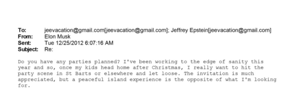 On Christmas Day 2012, Musk emailed Epstein, asking, “Do you have any parties planned?” Musk wrote that he “really wanted to hit the party scene.” Seeming to respond to an invitation to visit Epstein on his private island, Musk responded, “a peaceful island experience is the opposite of what I’m looking for.”