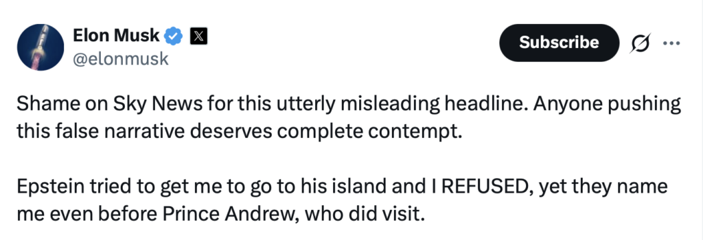 Also that year, Howard Lutnick, now serving as Commerce secretary, emailed Epstein to say he and his family would be traveling in the Caribbean and asked if they could meet for dinner, requesting Epstein’s exact location to give to his boat captain. Lutnick’s wife, Allison, appeared to follow up as the date grew closer, telling Epstein assistant Lesley Groff that their yacht’s name was Excellence and asking where the boat should go. The emails appear to contradict both men’s claims that they cut off ties with Epstein long before they actually did, and that they were on friendlier terms than they had indicated publicly. In September 2025, Musk wrote on X, “Epstein tried to get me to go to his island and I REFUSED.” Following the latest release, Musk has been vocal on his social media platform, X, defending his inclusion in the files. He claimed Epstein “hounded” him to visit the island, but says he “always declined.”