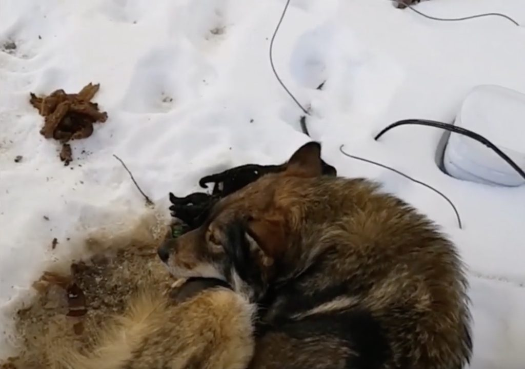 When they finally caught up, what they found was almost too painful to take in. There, huddled in a shallow dip in the snow, was a mother dog. Her body was trembling uncontrollably, her fur clinging with bits of ice and frost. She had just given birth—right there in the freezing cold. The sight was both heartbreaking and awe-inspiring: a mother’s desperate attempt to protect her babies against impossible odds. She curled herself tightly around her tiny puppies, but the bitter cold had already claimed two of them. Their small forms lay still beside her, silent victims of the harsh winter.