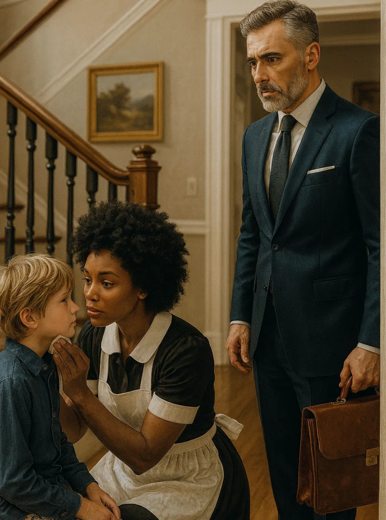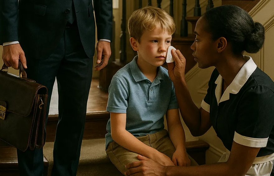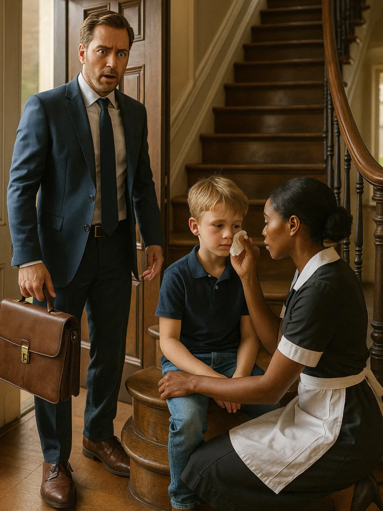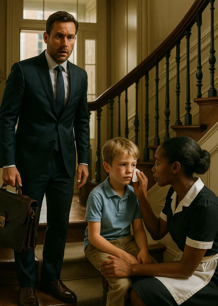 He stepped through the front door still holding his briefcase. On the staircase, his eight-year-old son, Oliver, sat stiffly, blue eyes bright with unshed tears. A faint bruise shadowed his cheek. Kneeling before him, the family’s caretaker, Grace, dabbed with a cool cloth and a tenderness that made the whole foyer feel like a chapel.