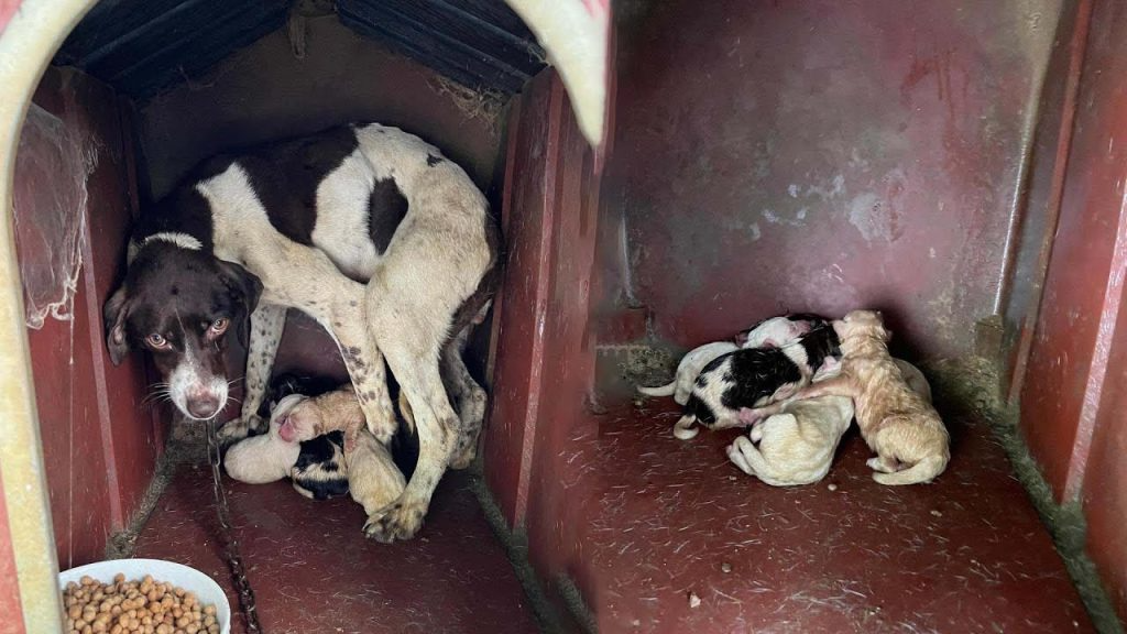 When rescuers arrive after receiving a call about animals left near the river, what they see nearly breaks their hearts. The doghouse is anchored just a few feet from the rushing water. A heavy chain locks the mother dog to a post, giving her no escape should the river rise any higher. Her puppies, still blind and helpless, press against her belly for warmth. The rescuers immediately understand that time is running out.