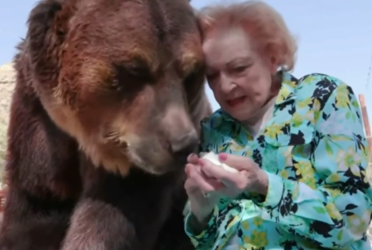 Her bond with animals was vividly captured in the 2018 documentary Betty White: First Lady of Television. In one unforgettable scene, she interacted with a grizzly bear at the Los Angeles Zoo, calmly petting and even kissing the massive animal on the forehead. The bear responded affectionately, taking snacks from her hand, illustrating White’s unique ability to connect with creatures of all kinds and her fearless, compassionate nature.