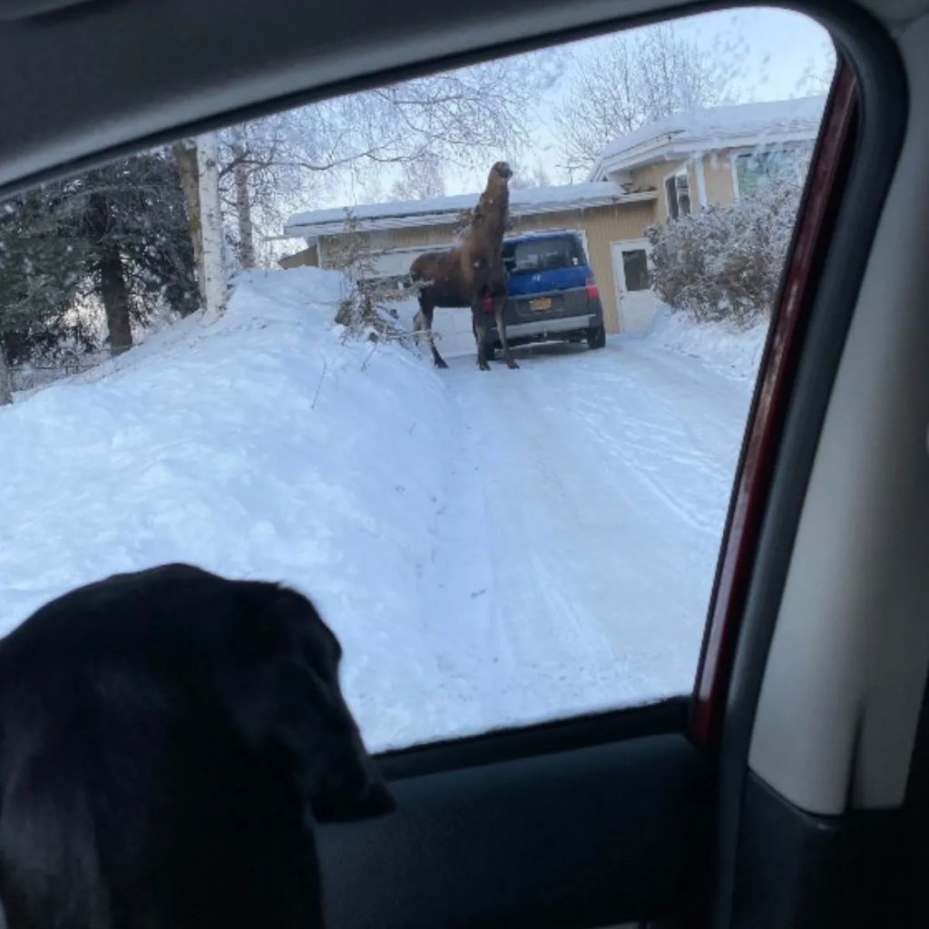 Eventually, with no fuss, the moose sauntered away from Ted’s driveway and into the neighboring yards, continuing her slow, deliberate search for food. For her, it was just another ordinary day in Alaska. For Clark and Starbuck, however, the encounter turned into an unexpectedly funny memory, immortalized by that perfectly mistimed snapshot.